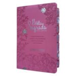 Bíblia com acabamento em couro bond, contém abas adesivas aplicadas e fitilho para marcação da passagem bíblica.